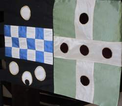 Banner #2 Description: (chevron and ravens) Argent a chevron Sable, flanked by three ravens trippant of the same, the raven in canton is superimposed by a rectangle barry of six of Argent and Blue, charged with a lion rampant Gules, the banner is surrounded on three sides by a black and white bordure.