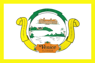 The Sertoma Club of Venice held a flag contest in 1984. The winning flag, chosen from 4 dozen entries, was designed by Jeffrey Soderland, then a senior at Venice High School. The flag includes such elements as Gulf shores, Venice farms, the old Hotel Venice, Kentucky Military Institute, and the Brotherhood of Locomotive Engineers. The flag was officially adopted with Resolution No. 851-84 on 14 November 1984.