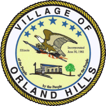 The seal depicts a eagle in flight carrying a set of arrows and a garb of wheat. Under the eagle is a depiction of the Orland Hills City Hall.