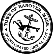 A yellow flag, containing the town seal at the center. The seal is a blue line drawing of a plow and anchor. The town and state names and date of incorporation are written around the edge. Hanover is in Plymouth County.