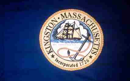 A dark blue flag, containing the town seal, showing a ship and fouled anchor. The town and state names and date of incorporation are written in black on a rope-edged ring around the seal. Kingston is in Plymouth County.