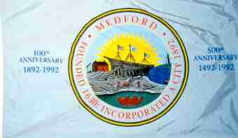 A white flag with a town seal in the center. The seal features a black ship flying three flags in the center, sundry smaller craft in the foreground, a red building before a golden sunrise in the background, and at the base a red crown. In a ring around are the town name and dates. The flag shown also bears notification of 100th and 500th anniversaries in 1992. Medford is in Middlesex County.