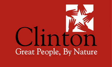 A red flag with the city name in black and the slogan below. Above that is an emblem of five hands and a star, which can also be seen at www.clintonmo.com