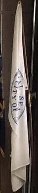 A city flag can be seen in the council chambers. It has a white field with the city seal in blue.