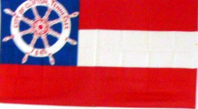Three horizontal bars, red-white-red, a canton of blue bearing a ship's wheel in white on which is written in red the name.