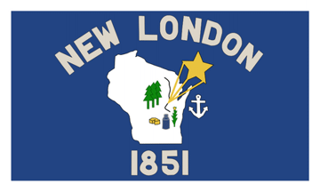 It is blue, bordered white, with a white map of Wisconsin bearing local symbols and yellow star pointing to the location of New London. The name is arched above the state and the foundation date below.