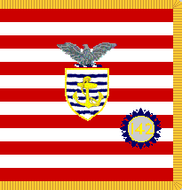 The "battle standard" of the U.S. Merchant Marine Academy at King's Point, New York. This square embroidered color is carried on parade between the S&S and the Academy flag. It commemorates the 142 cadet-midshipmen who gave their lives during World War II. Unlike the armed forces academies, which accelerated their programs to produce additional officers but did not actually send their students into active service before graduation, King's Point students served as junior officers aboard merchant vessels. The 142 who were killed far exceeds the number of cadets or midshipmen who have been
