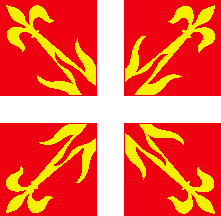 Along each diagonal a yellow bar which ends in a fleur-de-lys. Extending