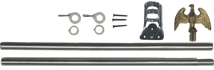 | Economical lightweight three-piece 6' rust resistant 3/4" pole kit. Includes gold plastic eagle, rings to attach flag and steel bracket for mounting on porch, side of house, etc. | ||